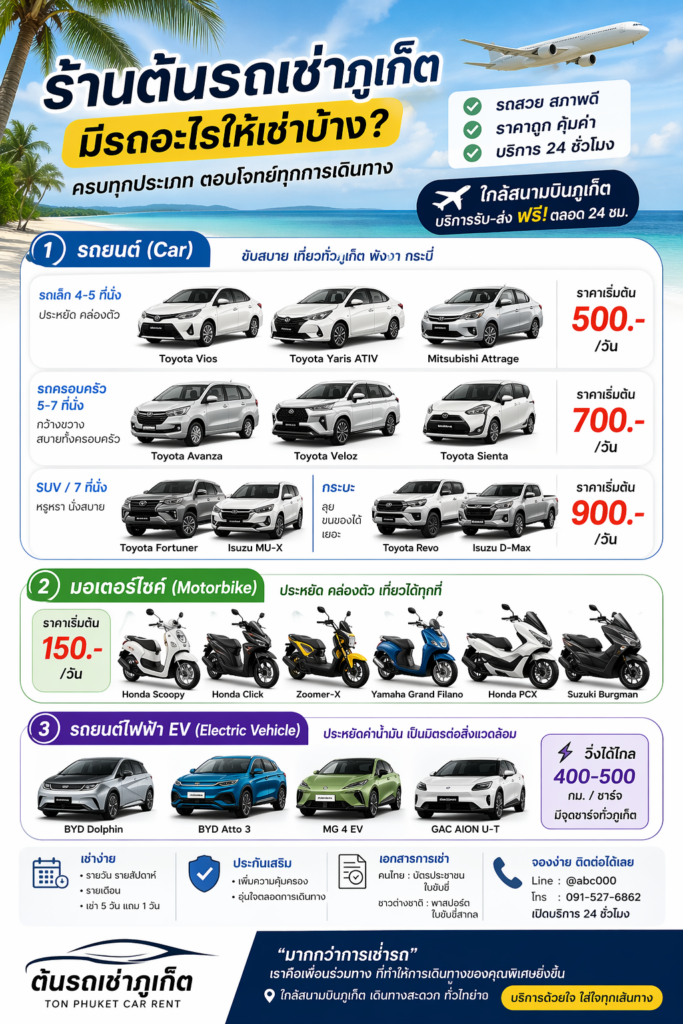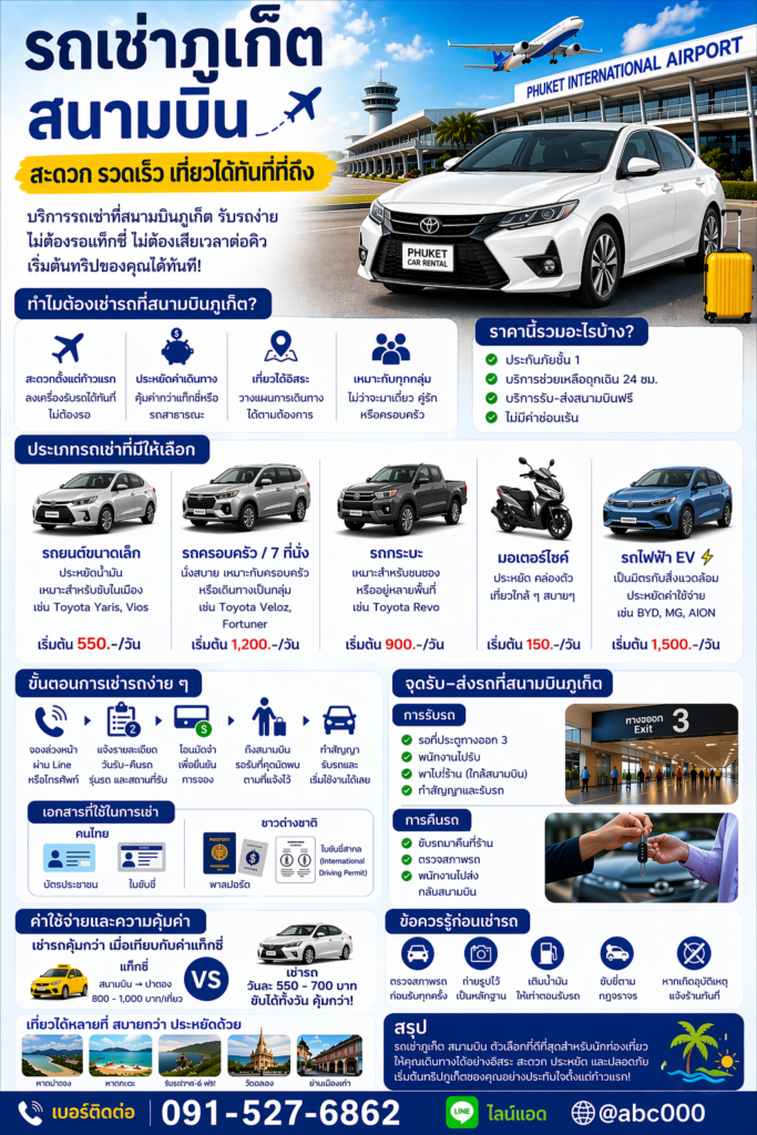 หากเลือกผู้ให้บริการที่มีความน่าเชื่อถือ รถใหม่ ราคาเป็นกันเอง และมีบริการรับ–ส่งสนามบินฟรี ก็จะช่วยให้คุณเริ่มต้นทริปในภูเก็ตได้อย่างราบรื่นและประทับใจตั้งแต่ก้าวแรก ✨